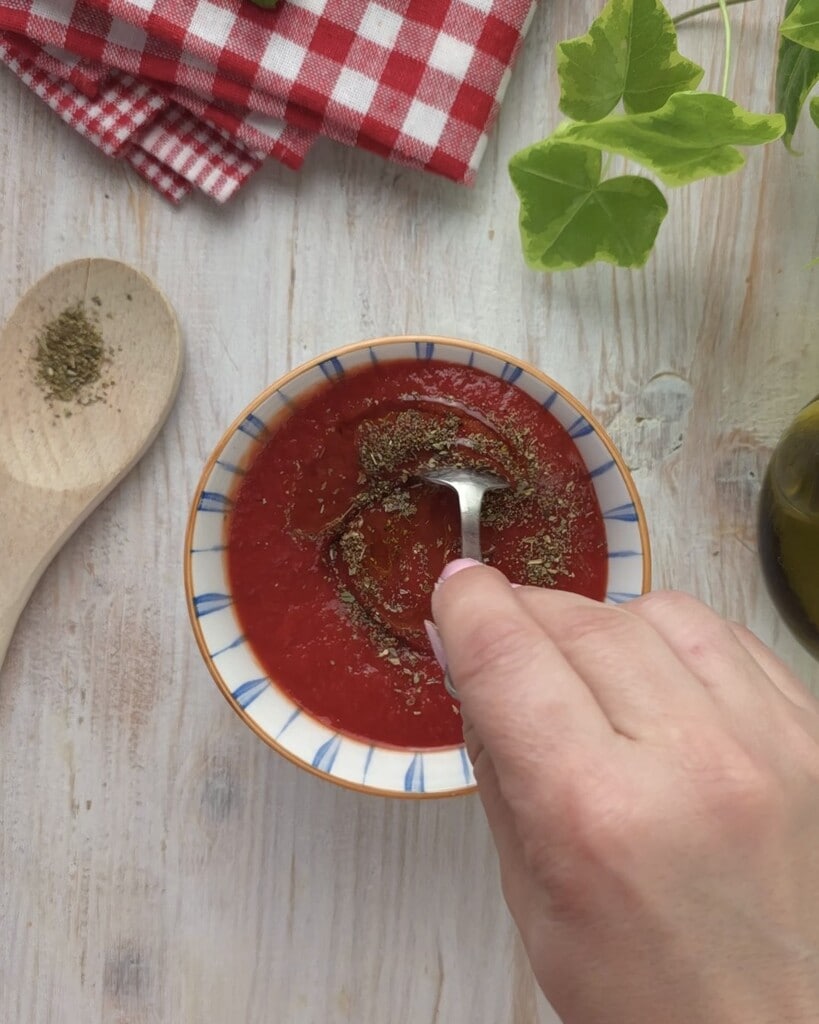 Primeiro, tempere a polpa de tomate com sal, orégano e azeite e misture.
