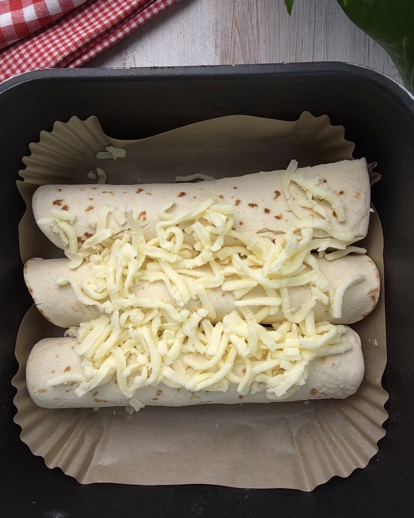 Coloque todas as piadinhas próximas no cesto da fritadeira sem óleo forrado com papel manteiga e polvilhe a superfície com mais muçarela. Cozinhe por 7 minutos.