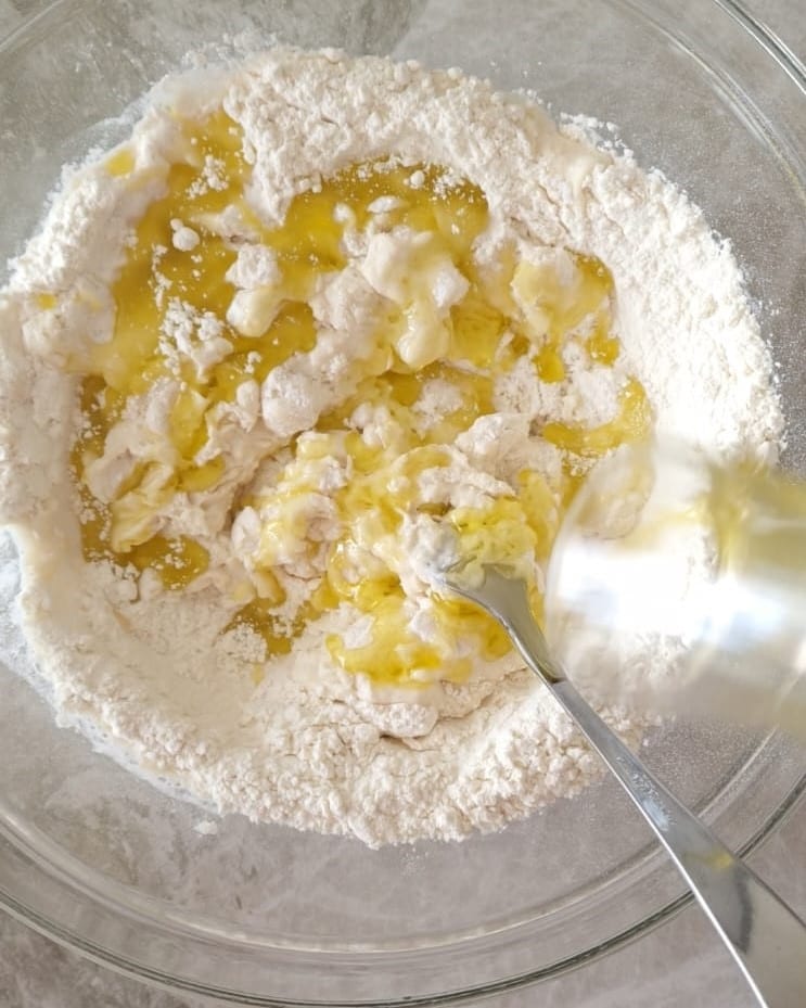 Pegue uma tigela grande, coloque a farinha, o bicarbonato, a água, o óleo e o sal, misture bem.