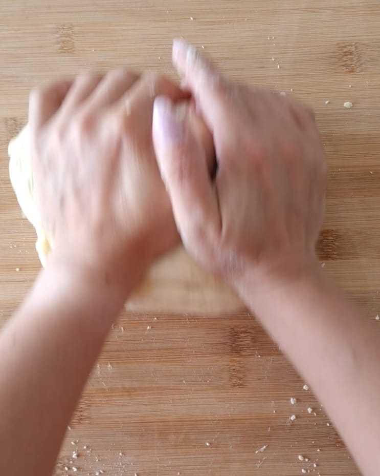 Transfira a mistura para uma bancada e continue amassando até se tornar uma massa macia e compacta.