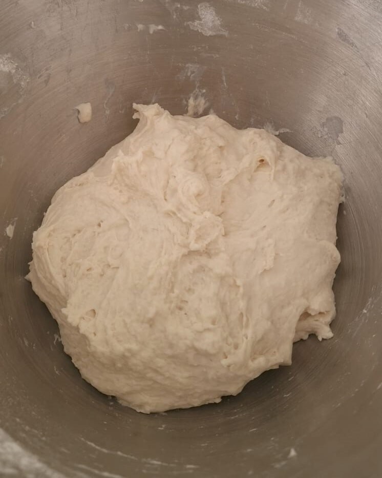 Passado o tempo de descanso, faça as dobras em direção ao centro, e repita esta operação após 15 minutos, (portanto 2 vezes as dobras) neste ponto forme uma bola e transfira para uma tigela bem untada.