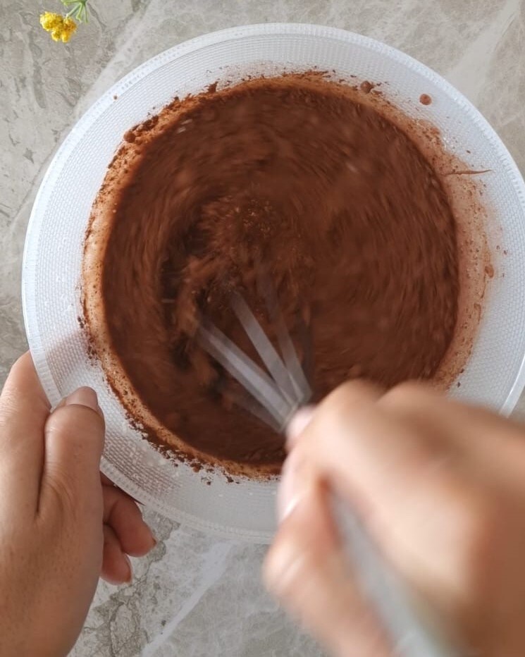 Enquanto isso, em uma tigela à parte, misture o leite restante com o cacau, o amido de milho e a Nutella.