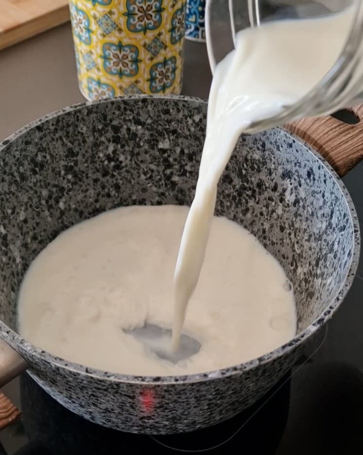 • Misture bem com um batedor até formar uma mistura sem grumos. Adicione a mistura ao leite quente que está na panela.