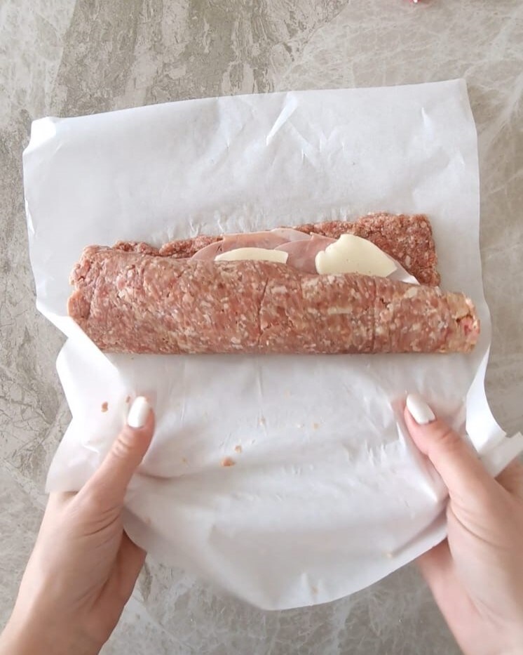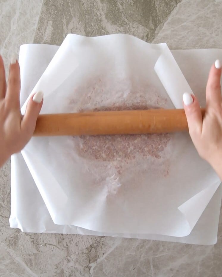 Em seguida, estenda a carne entre duas folhas de papel manteiga e pressione com um rolo, formando um retângulo.