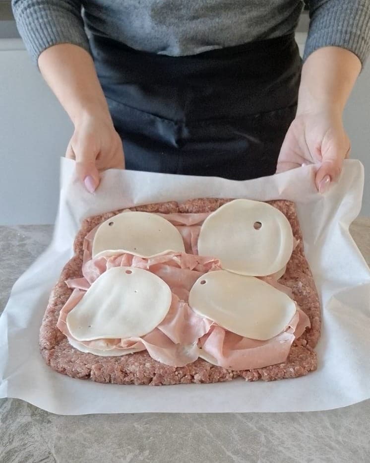 Neste ponto, recheie a superfície do rolo com mortadela e queijo em fatias.
