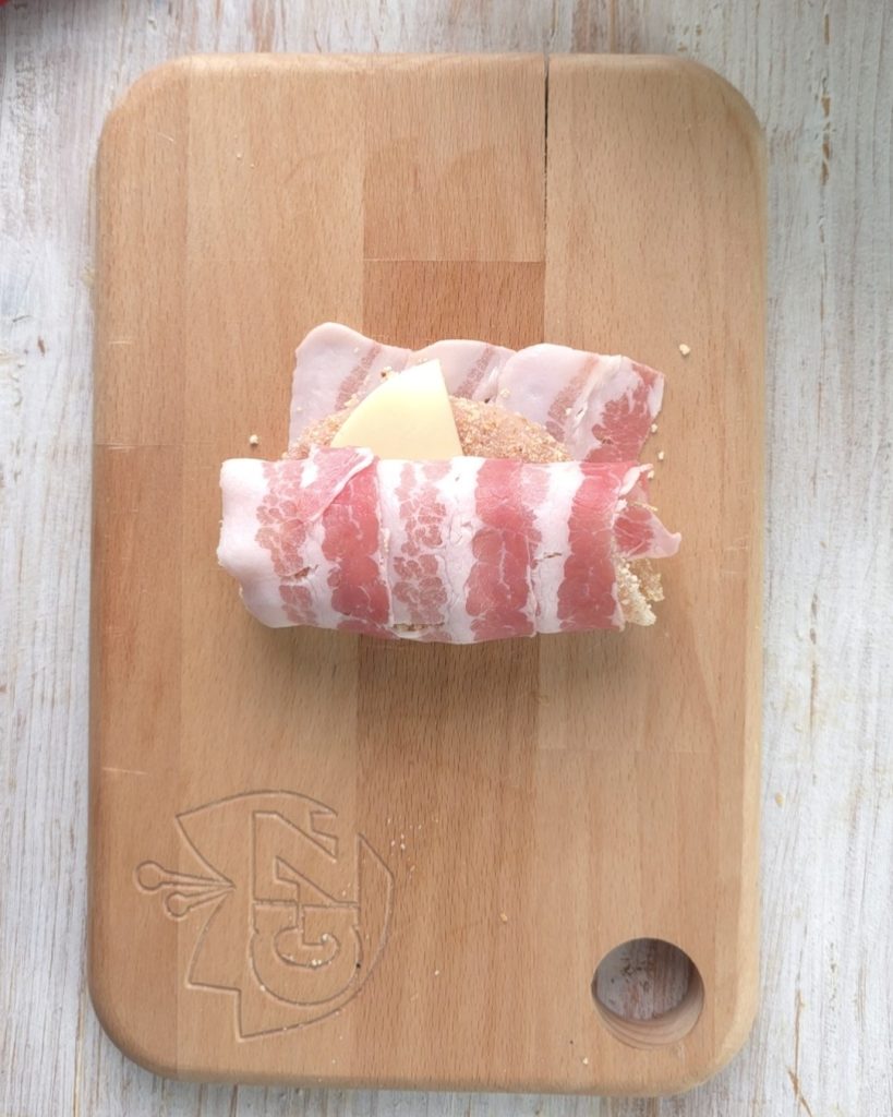 Em separado, sobre uma tábua, disponha fatias de bacon, uma fatia de peito de frango empanado e uma de queijo, depois enrole.
