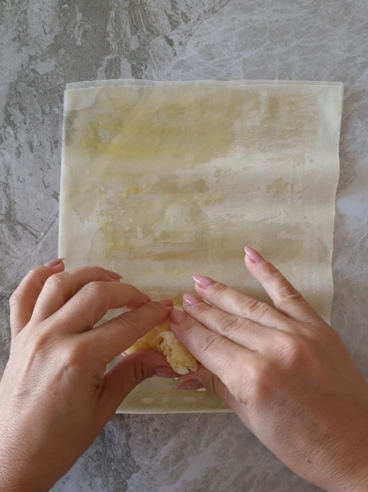 Pegue um pouco do recheio e coloque nas folhas de massa filo. Dobre as duas bordas laterais para dentro e enrole o rolinho começando pela base. Repita os passos descritos para o restante dos ingredientes.