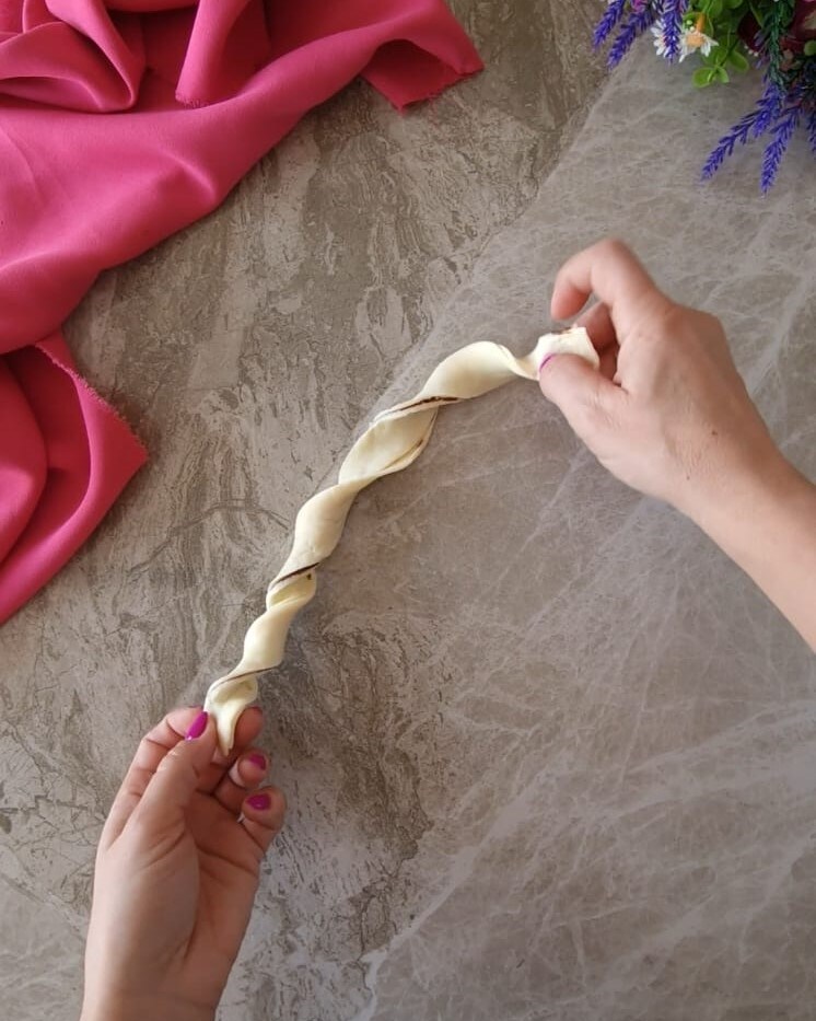Enrole cada tira sobre si mesma e depois enrole dando forma de um rolinho.