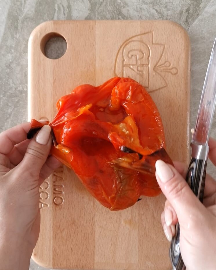 Retire a pele dos pimentões, retire as sementes e corte em partes de forma a ter no total 7-8 filetes.