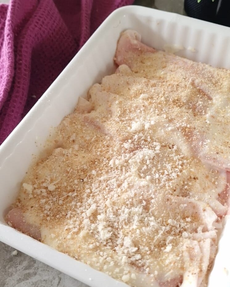 Neste ponto, decore com o molho bechamel. Polvilhe a superfície com farinha de rosca e parmesão.