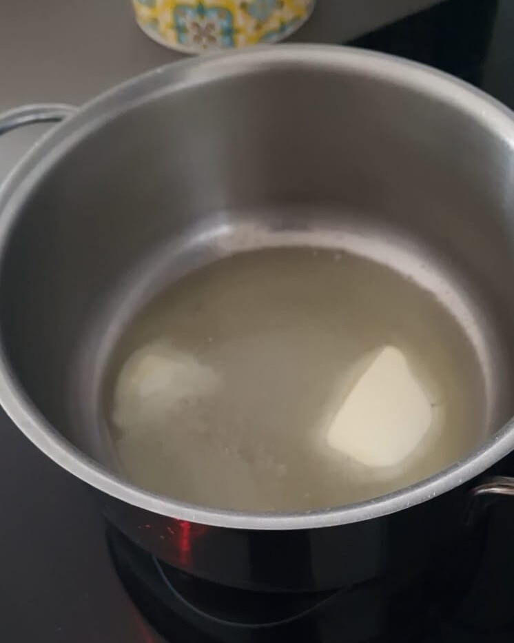 Derreta a manteiga em uma panelinha em fogo baixo, neste ponto desligue o fogo e adicione a farinha peneirada mexendo com um batedor para evitar a formação de grumos.