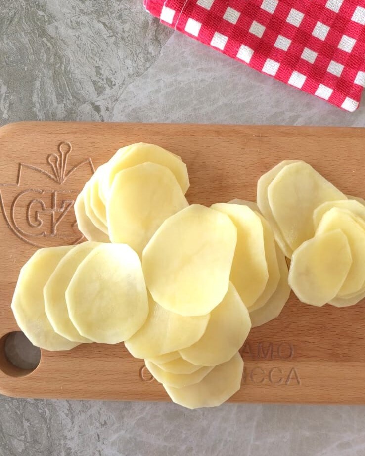 • Comece descascando as batatas, em seguida, corte-as em fatias finíssimas, com o mandolim ou fatiador.