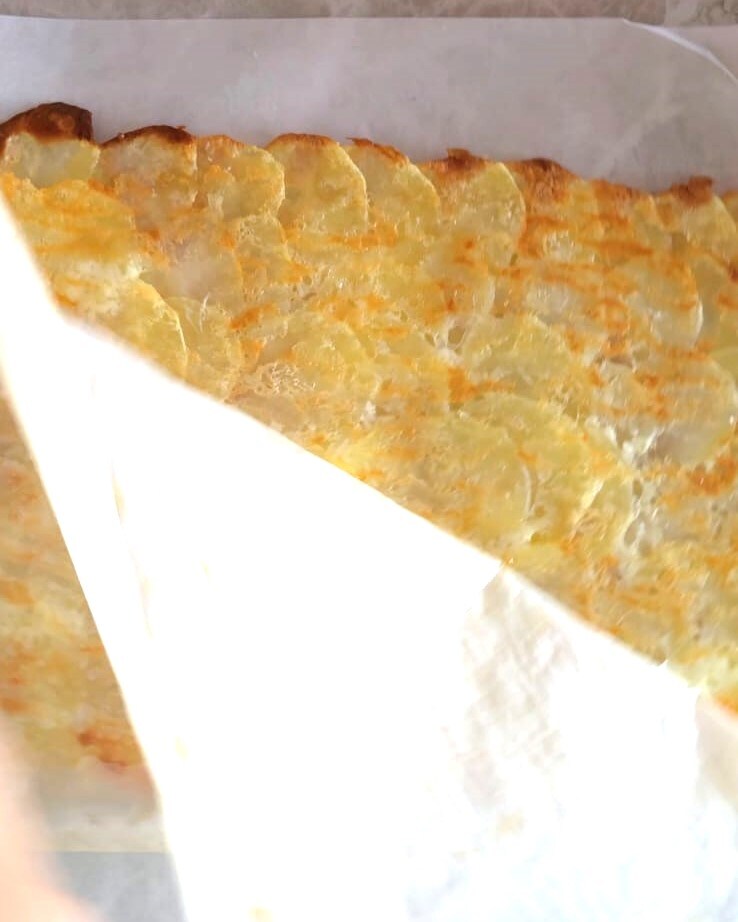 • Forre uma assadeira com papel manteiga, depois polvilhe com o queijo ralado, em seguida, coloque as fatias de batata uma ao lado da outra.