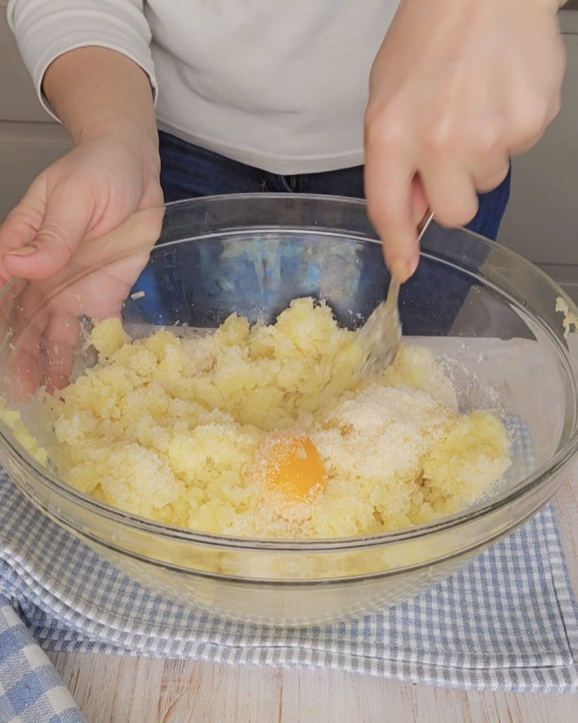 • Adicione às batatas quentes, o sal, o queijo ralado e o ovo e misture tudo, você deve obter uma massa bem homogênea.