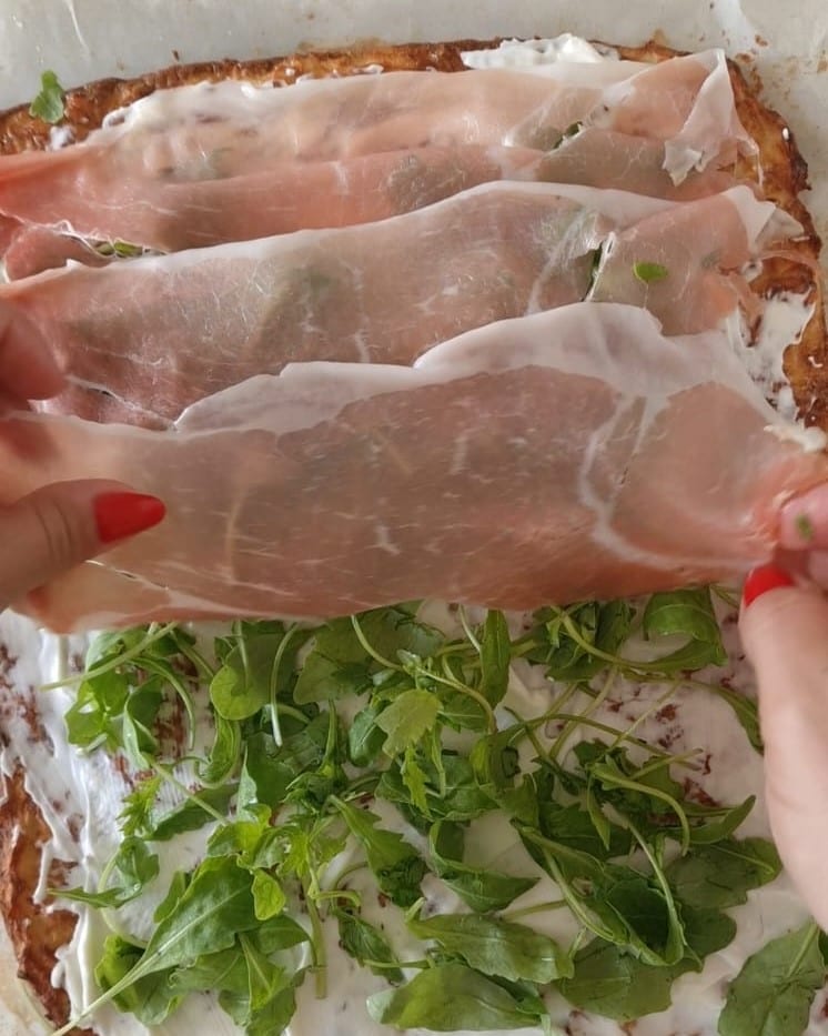 Retire do forno e em seguida, sem deixá-lo esfriar, recheie a superfície com queijo Philadelphia, rúcula e speck.