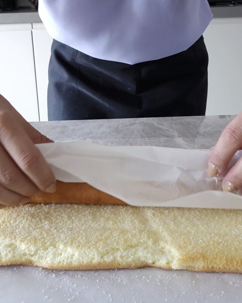 Após o tempo de cozimento, retire imediatamente a massa do biscoito da assadeira e vire-a sobre outra folha de papel e em seguida remova-a, polvilhe com açúcar e enrole a massa do biscoito, então deixe esfriar completamente enrolada.
