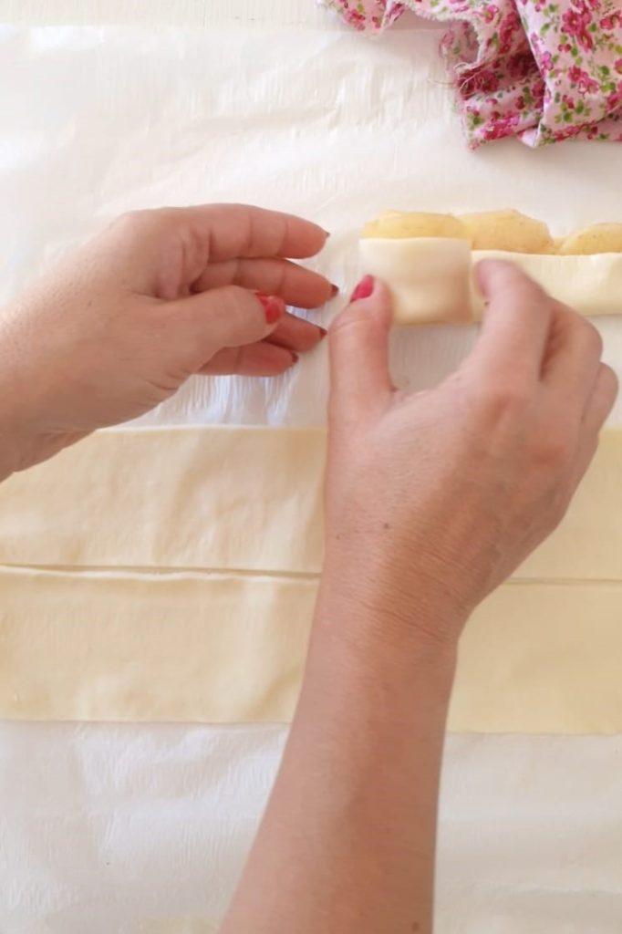 Então, pegue a extremidade e enrole a massa folhada recheada.