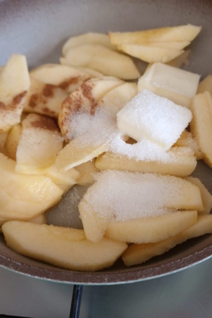 Adicione à frigideira a manteiga, a água, o açúcar e a canela e cozinhe em fogo baixo por 7/8 minutos.