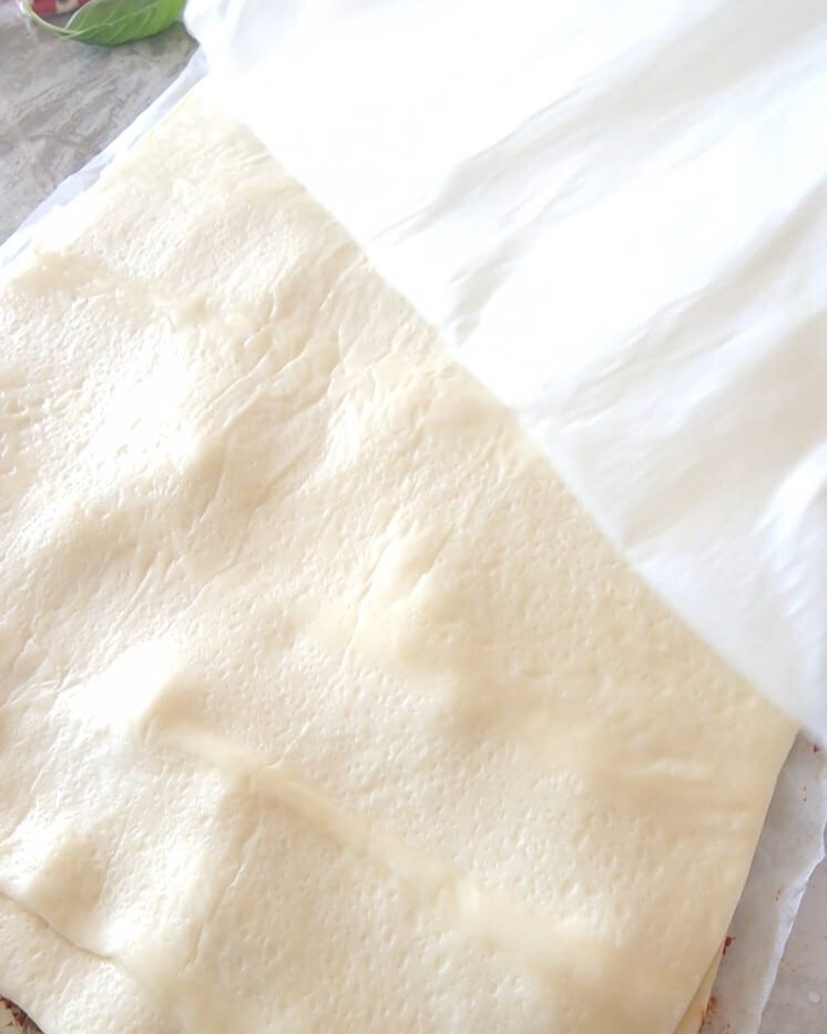 Neste ponto, com o segundo rolo de massa de pizza, cubra o recheio fazendo-o aderir à base.