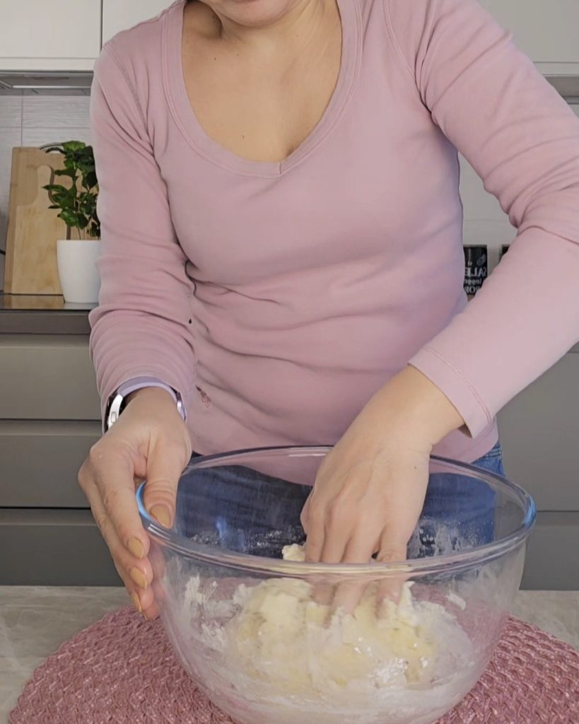Em seguida, adicione o ovo e despeje o leite morno e o óleo, misture bem tudo por 5 minutos e forme uma bola.