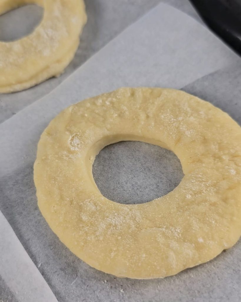 Então, coloque as rosquinhas em uma assadeira com um pedaço de papel manteiga e deixe crescer por 30 minutos no forno desligado com a luz acesa.