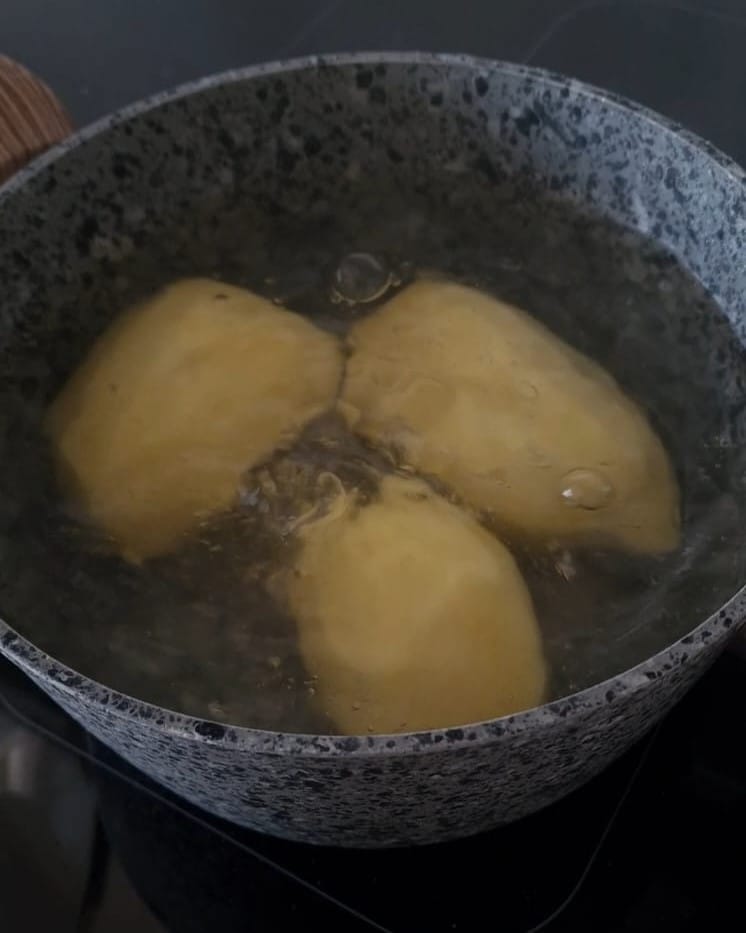 Descasque as batatas e, em seguida, escalde-as por 6 minutos em água fervente salgada.