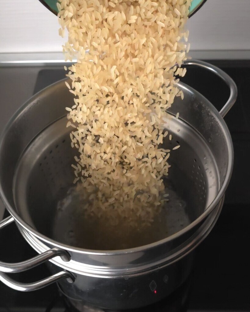 Cozinhem o arroz em bastante água salgada, em seguida escorram e coloquem-no em uma assadeira, espalhem e deixem esfriar.