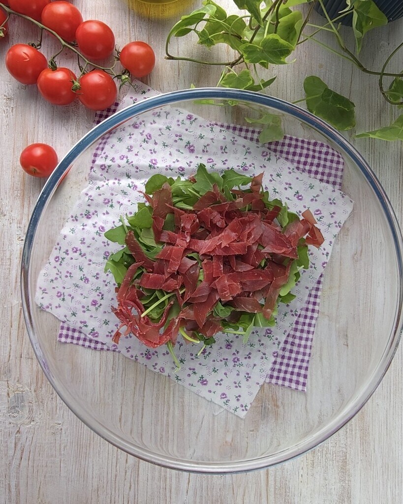 Corte a bresaola em fatias e coloque em uma tigela, junto com a rúcula. Adicione o arroz frio e o Grana em lascas.