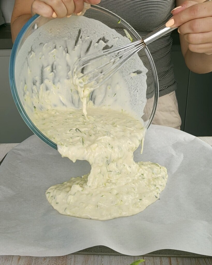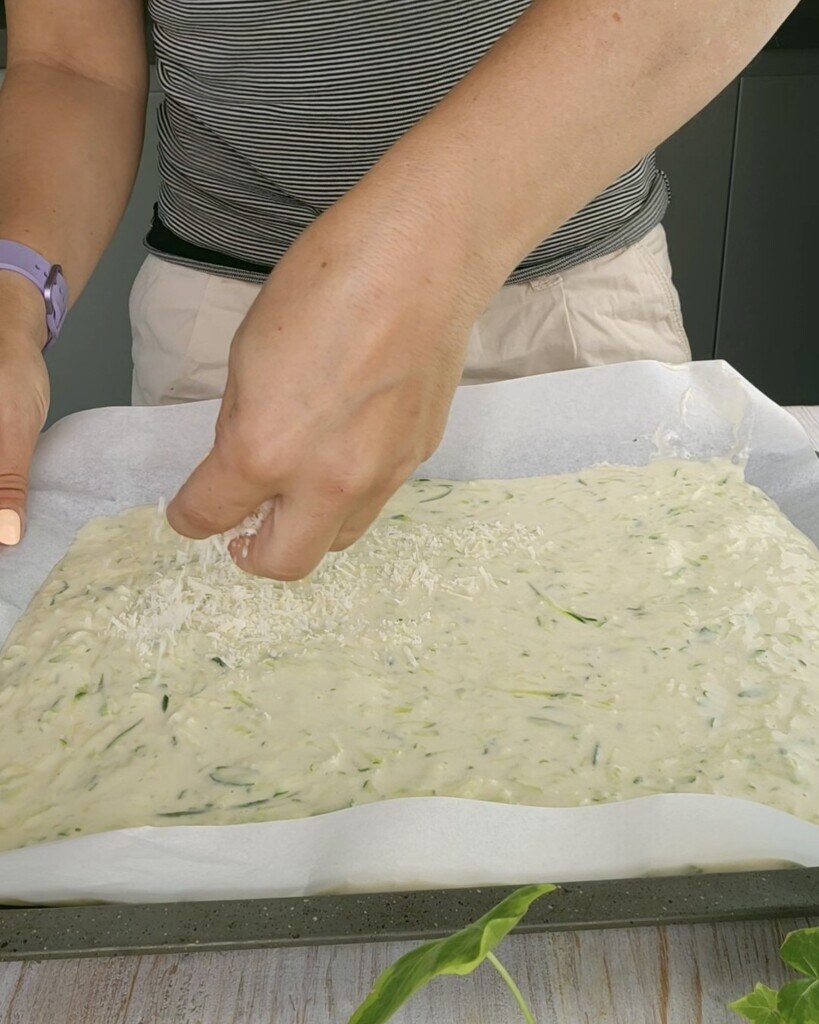 • Neste ponto, unte e pincele uma assadeira de 24×15 cm ou forre-a com papel manteiga. Despeje a mistura e, por último, polvilhe a superfície com o parmesão ralado.