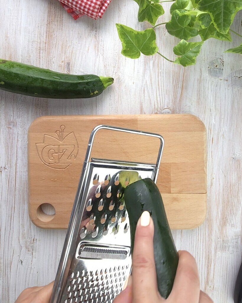 • Primeiro, corte as extremidades das abobrinhas, depois rale-as com um ralador de furos grandes, e reserve.