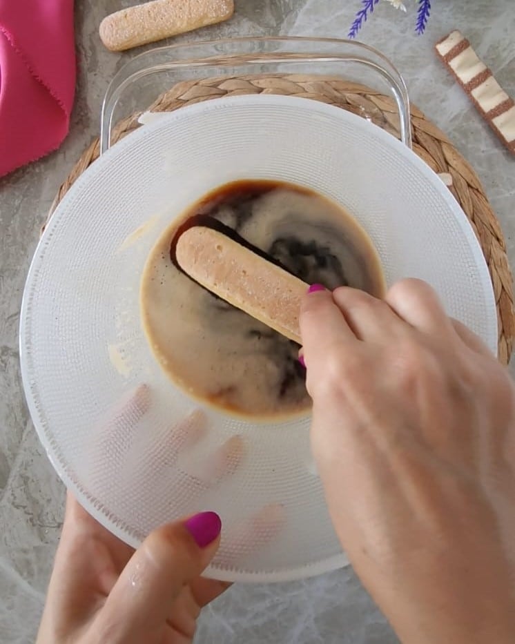 Em seguida, faça o café e molhe os biscoitos, embeber ligeiramente, depois coloque-os lado a lado sobre o creme.