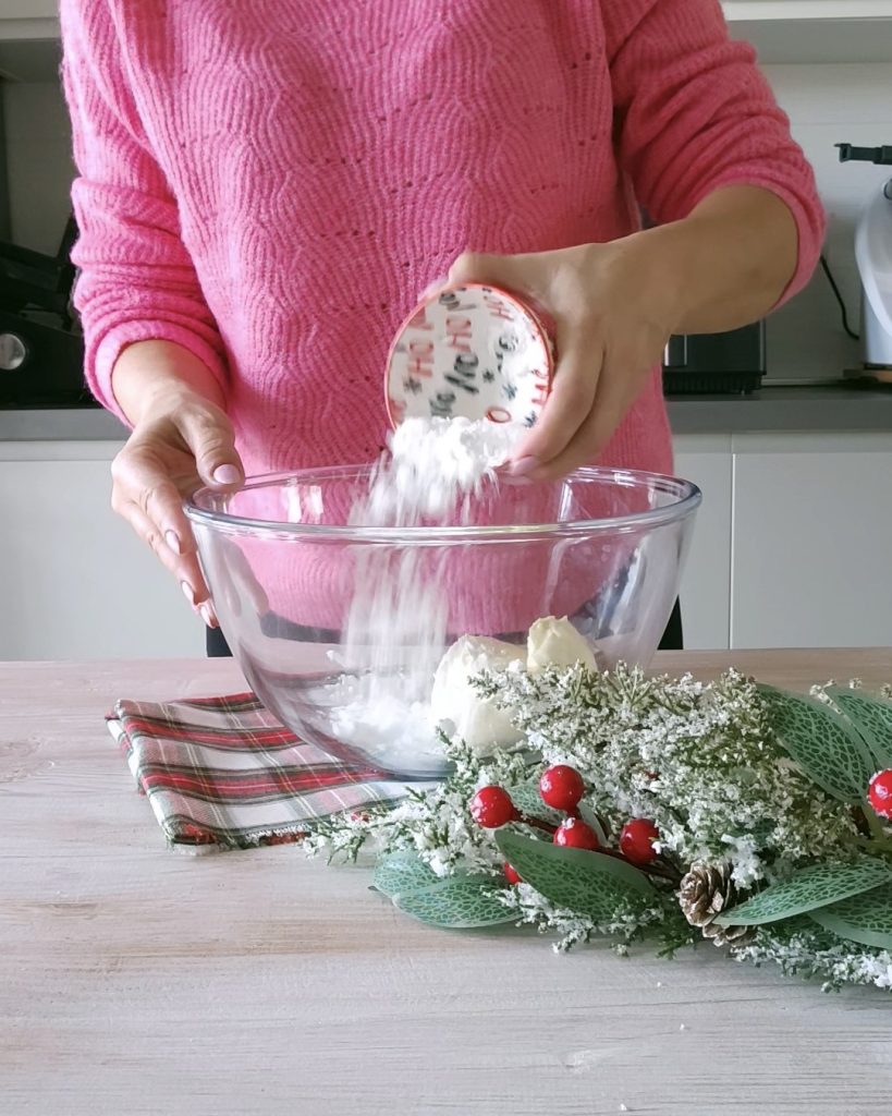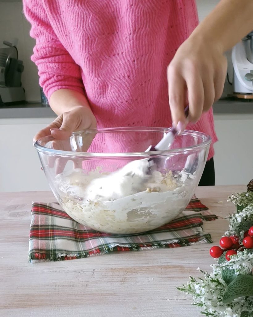 Em uma tigela, misture o mascarpone com o açúcar, depois em um mixer bata o torrone cortado em pedacinhos e adicione à mistura de mascarpone.