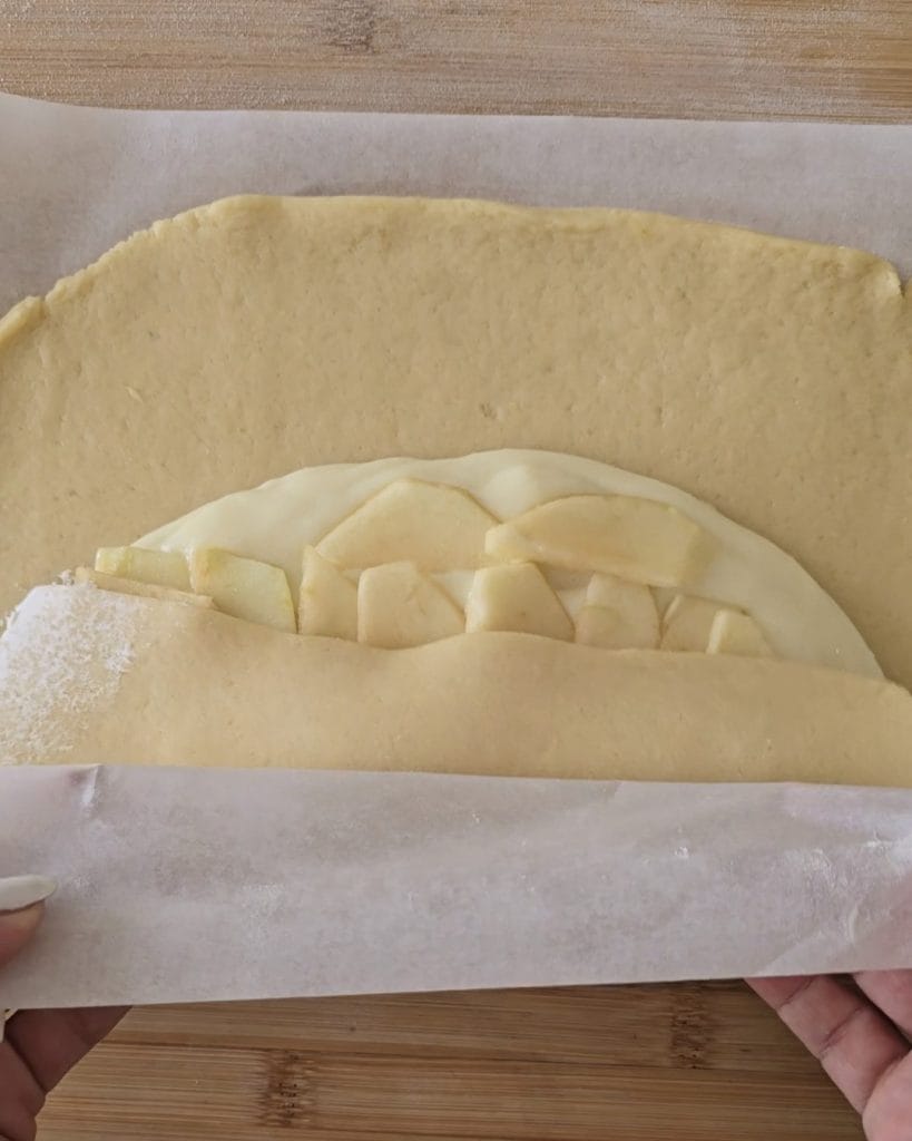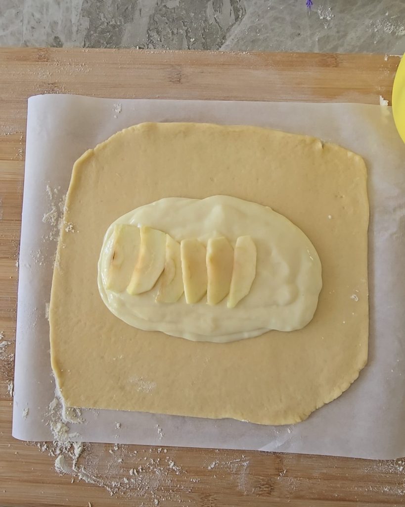 Recheie o centro da massa com o creme de confeiteiro e uma maçã fatiada.