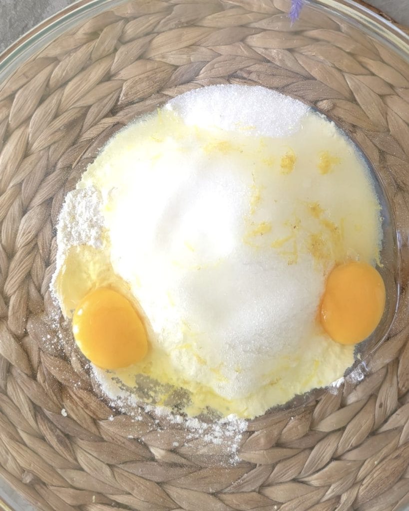 Numa tigela grande, coloque a farinha, o fermento, o açúcar, a casca de limão ralada, a manteiga amolecida e os ovos.