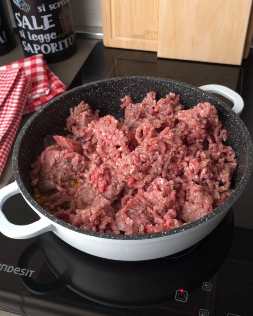 Adicione a carne, o sal e depois adicione o vinho e deixe evaporar. Em seguida despeje a passata de tomate e continue o cozimento por mais 20 minutos.