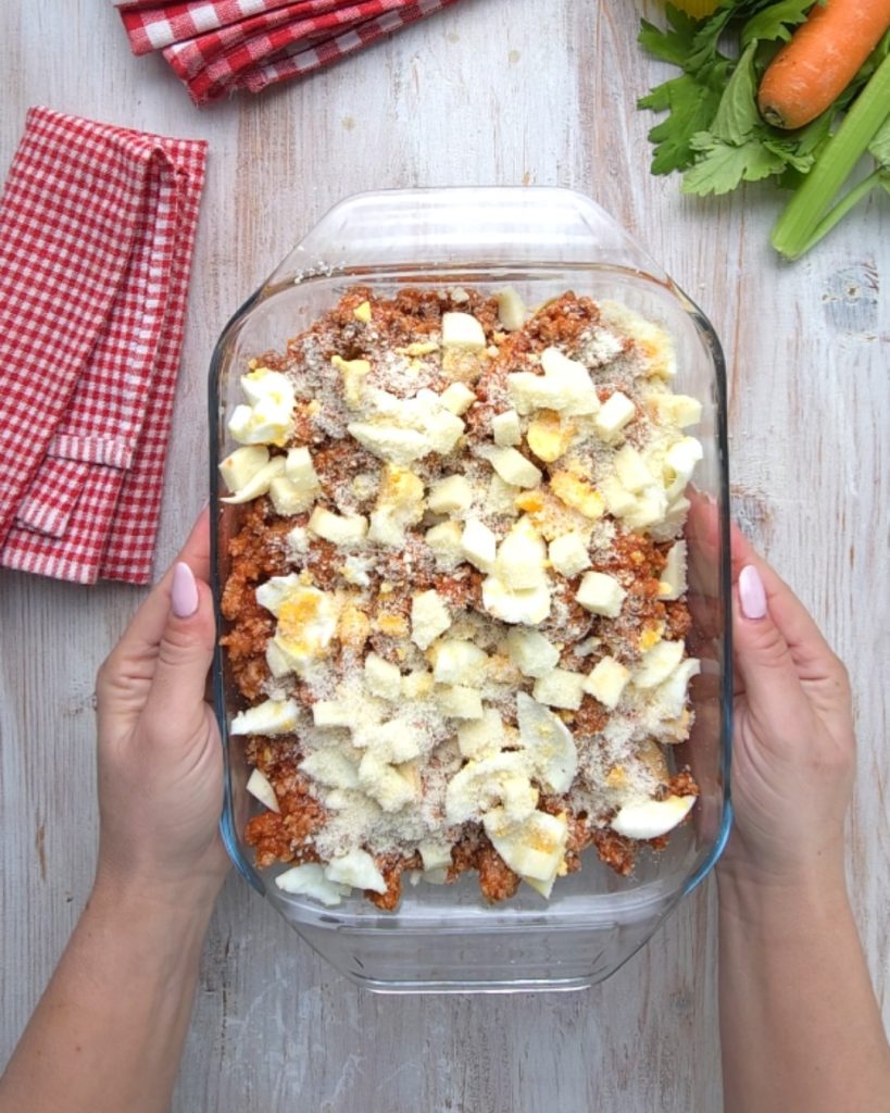 Cubra os ninhos com bastante molho, scamorza e parmesão. Agora leve ao forno a 170°C por 30-35 minutos; na metade do tempo, despeje duas conchas de caldo de legumes ou água quente. Retire do forno os seus ninhos de tagliatelle e sirva quentes.