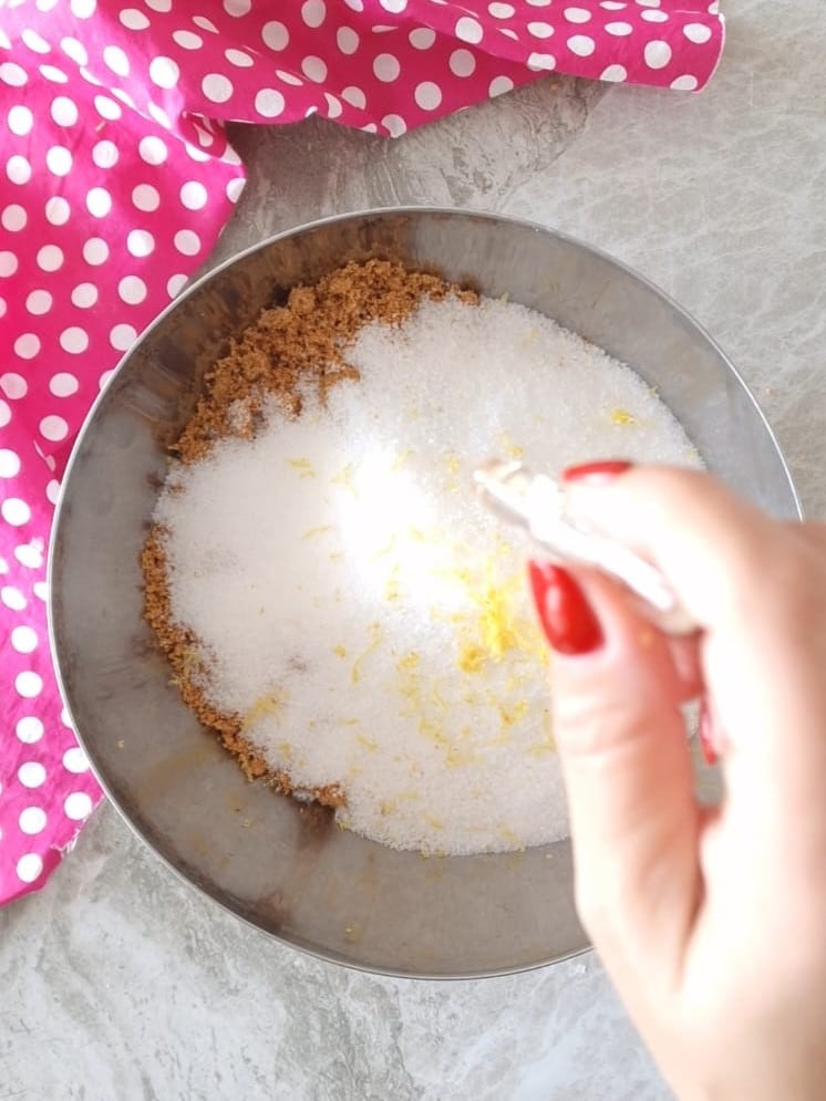 Em uma tigela grande, reúna as amêndoas trituradas junto com o açúcar, o aroma de amêndoas amargas e as raspas de limão.