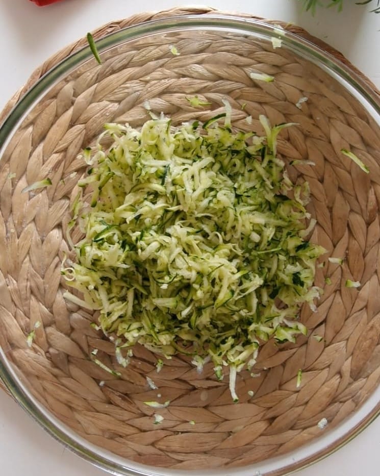 Comece cortando as extremidades das abobrinhas, em seguida, rale-as com um ralador de furos grandes.