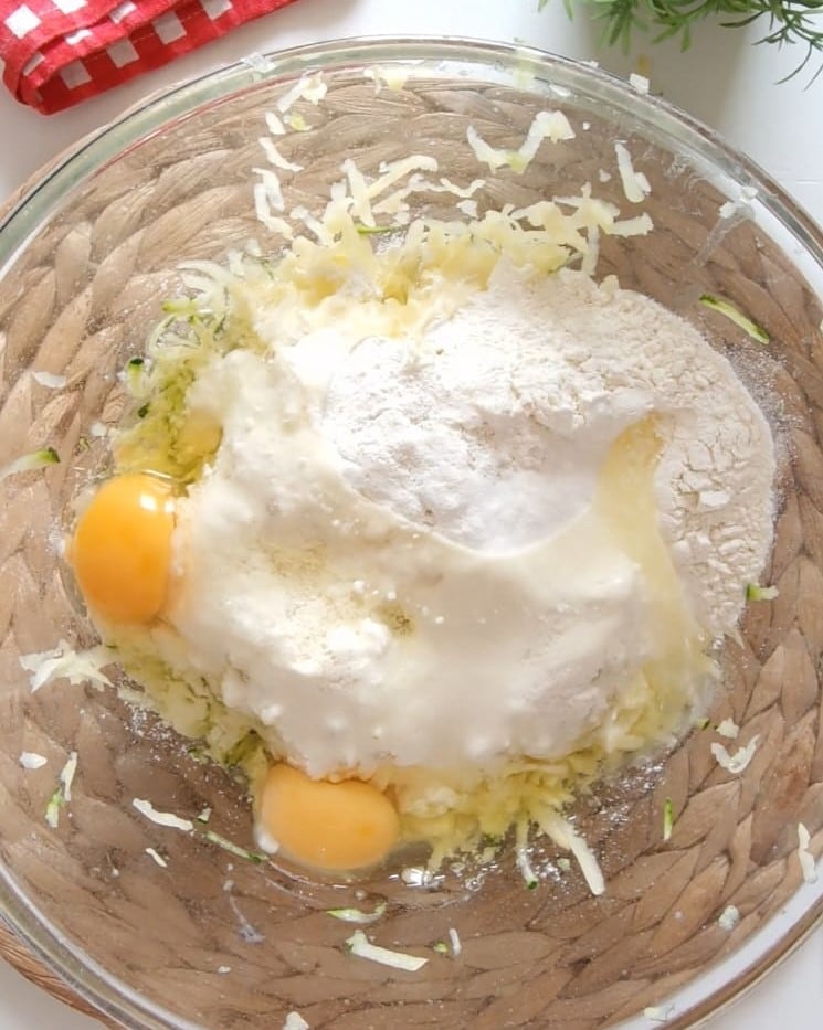 Descasque as batatas e rale-as, em seguida, coloque os vegetais bem espremidos em uma tigela.