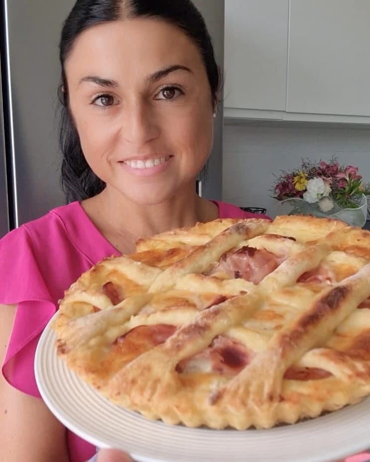 Depois, recheie com presunto cozido e scamorza cortada em cubos. Com a parte da massa que sobrar, forme losangos e coloque-os sobre o recheio de modo a formar uma grade.