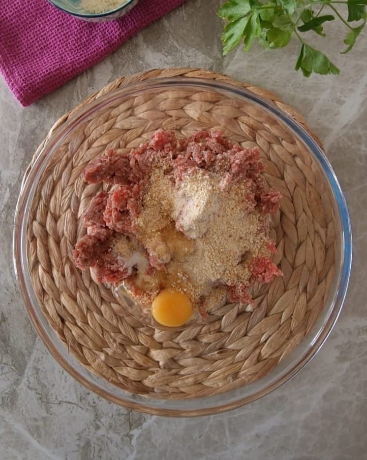 Em uma tigela, coloque a carne moída, o parmesão, o ovo, depois sal e pimenta e misture tudo bem com as mãos.