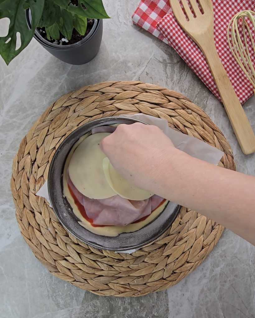 Despeje metade da mistura em uma forma de 22 cm forrada com papel manteiga, ou alternativamente, você pode untá-la e enfarinhá-la. Continue, despejando uma camada de molho de tomate previamente temperado com sal e orégano.