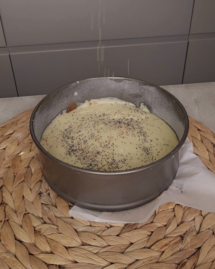 Em seguida, despeje o restante da massa por cima e com uma espátula nivele, a seguir decore com sementes de gergelim.