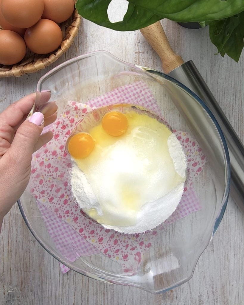 Em uma tigela, coloque a farinha, o fermento, o açúcar, a “vanillina”, os ovos e, por último, a manteiga amolecida cortada em pedaços.