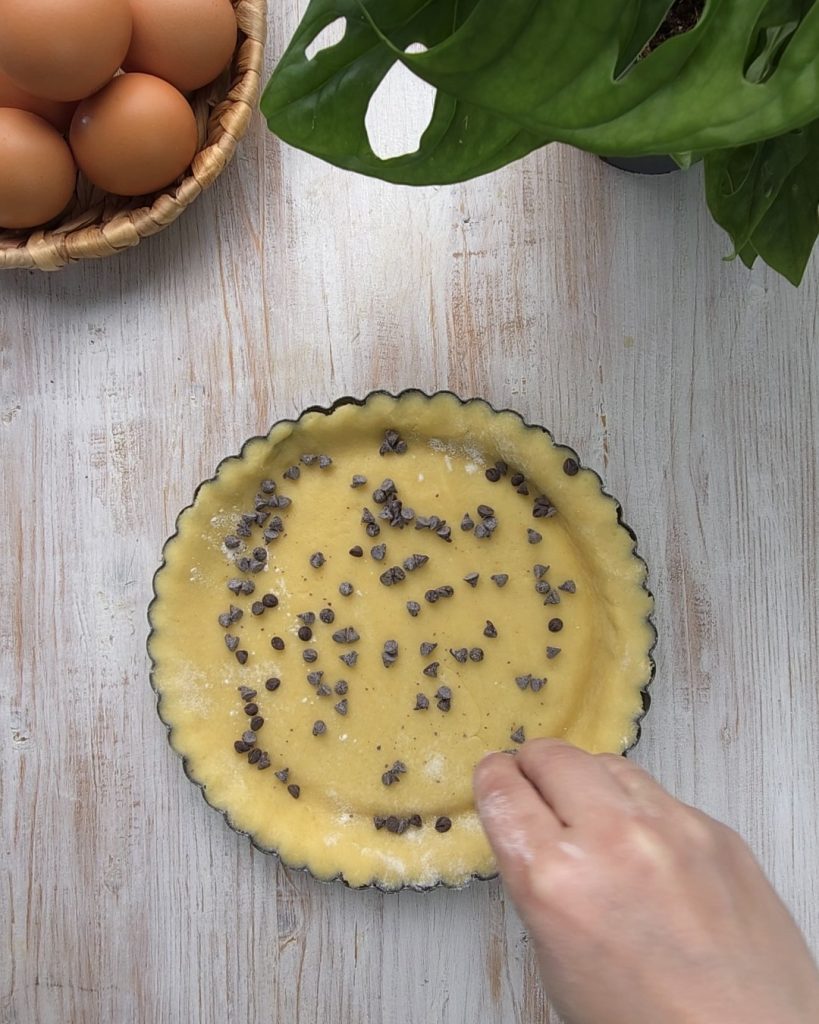 Estenda a parte restante entre duas folhas de papel manteiga, e forre uma forma esperta de 24 cm e adicione as gotas de chocolate no fundo.