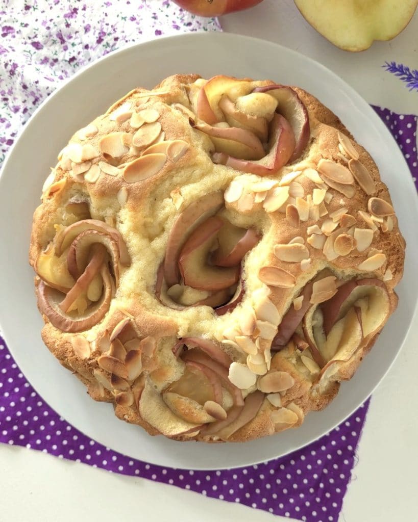 Decore com as rosas de maçã, polvilhe o bolo com lâminas de amêndoas.