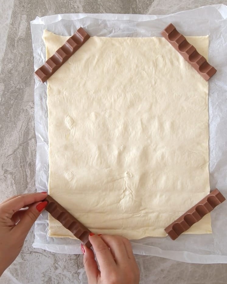Desenrole sobre a bancada a massa folhada, sem tirar o papel manteiga. Coloque nos quatro cantos as barras de Kinder Maxi.
