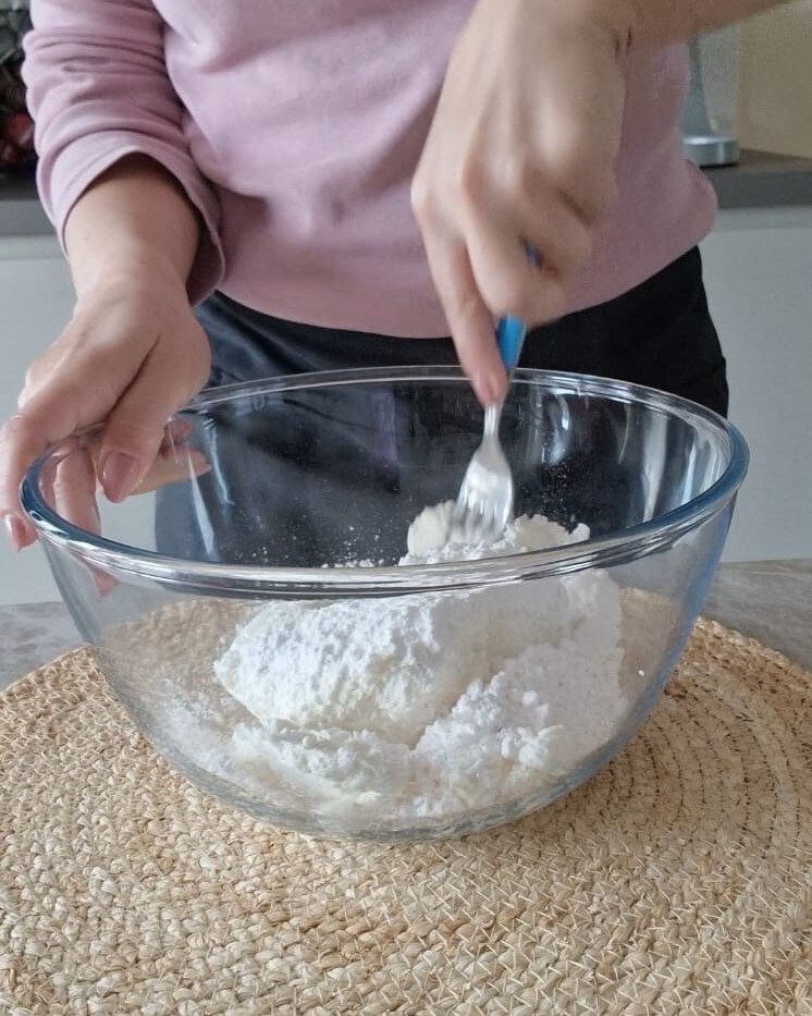 Em uma tigela, coloque a ricota e o açúcar de confeiteiro e misture.