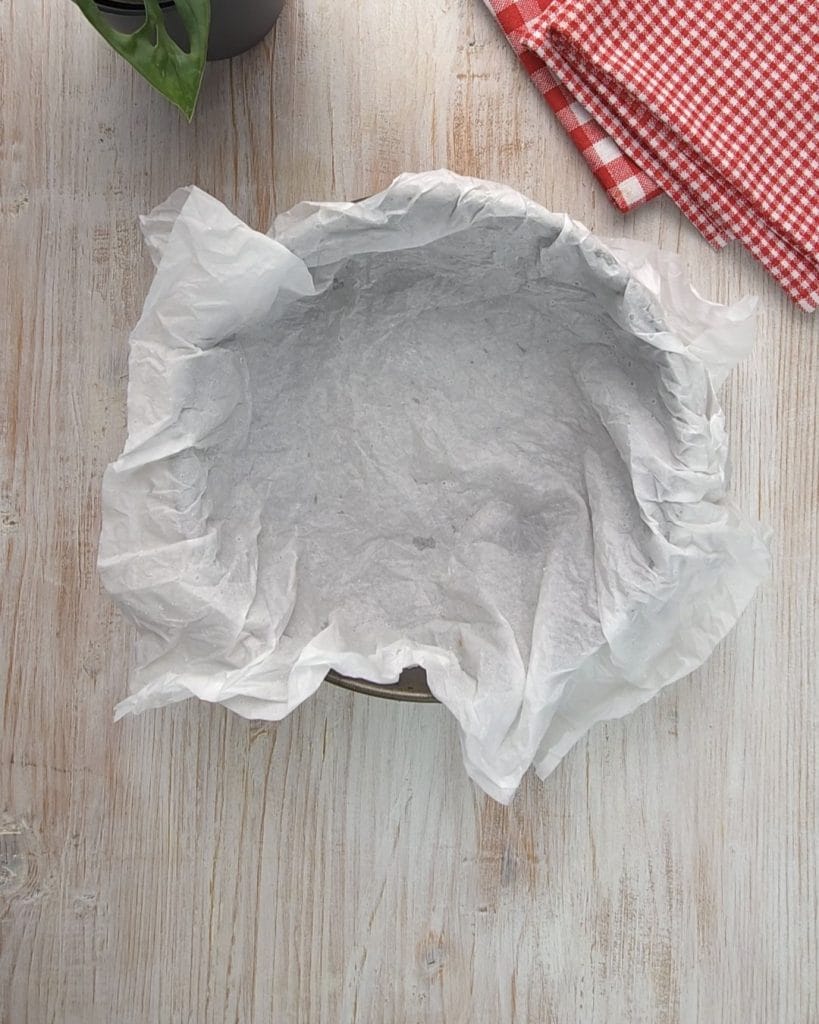 Pegue uma forma de aro removível de 20 cm. Depois, molhe uma folha de papel manteiga, esprema-a e coloque-a dentro da forma.