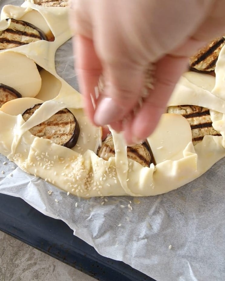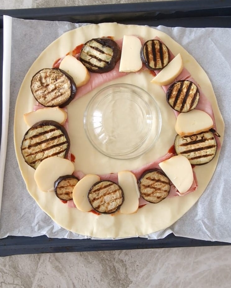 Torta sol aperitivo saboroso, fácil e rápida, perfeita para impressionar a todos; a receita é daquelas bem simples, com poucos ingredientes: massa folhada, 1 berinjela, presunto e queijo.